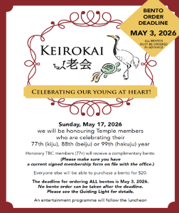 If you or a loved one will be 77 years or older by this year’s Keirokai, visit the Temple’s Keirokai page for full details on how you can submit your/their name as an honouree.